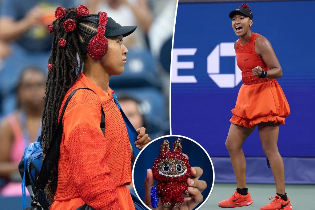Osaka made her grand entrance in a ponytail adorned with a dozen jeweled crimson roses, matching headphones and a crystal-covered Labubu doll cheekily nicknamed “Billie Jean Bling.”